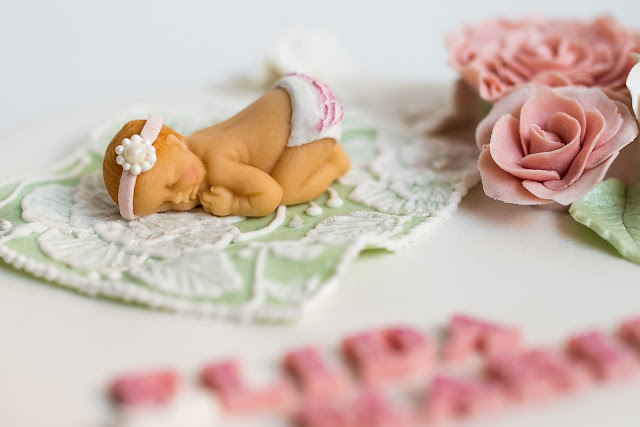 Babyen ligger og sover på et "ullteppe" inspirert av ullteppene som Elida har selv. Teppet er håndmalt med Royal icing. Dette var noe nytt for meg å gjøre, veldig spennende å prøve nye teknikker! og det var så gøy. Babyen har fått på seg en pyntetruse med ruffles eller volanger om du vil ;) Hodepynten har jeg laget med marsipan og sukkerkuler.